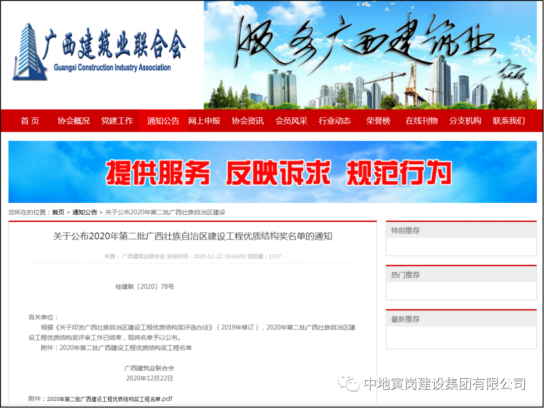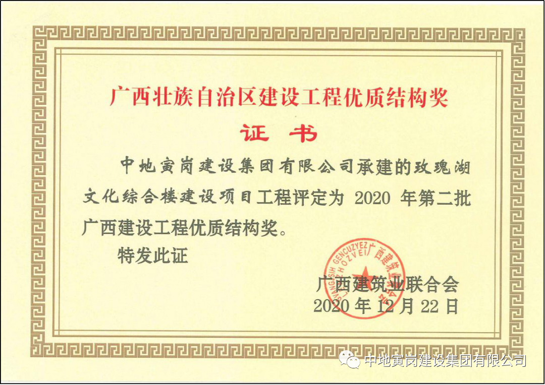 2020年12月22日,广西建筑业联合会根据《关于印发广西壮族自治区建设工程优质结构奖评选办法》将我公司承建的“玫瑰湖文化综合楼建设项目”评定为2020年第二批广西壮族自治区建设工程优质结构奖。
