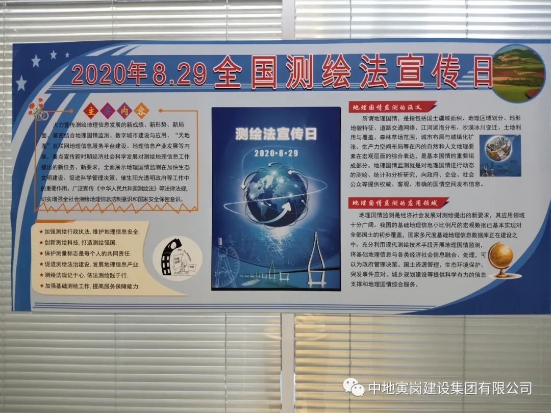 2020年8月29日是第17个全国测绘法宣传日。为响应和贯彻落实市自然资源部局《关于开展2020测绘法宣传日暨国家版图意识宣传周活动的通知》要求,中地寅岗建设集团有限公司通过摆放宣传展板、张贴宣传海报、电子屏公示等方式,开展“2020测绘法宣传日暨国家版图意识宣传周活动”。