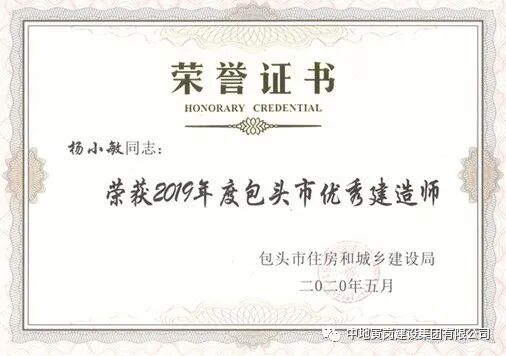经集团公司申报、包头市建筑业协会初审推荐、包头市住房和城乡建设局评选,我公司杨小敏、陈凯义、李大磊、王晓波、侯志良、王阳、陈玉远、谢学先、陈馥炯等9人荣获“2019年度包头市优秀建造师”荣誉称号。