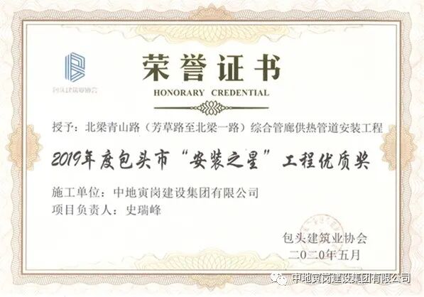 根据《包头市“安装之星”工程优质奖评选办法》有关规定,寅岗集团申报的项目“北梁青山路(芳草路至北梁一路)综合管廊供热管道安装工程”荣获“2019年度包头市“安装之星”工程优质奖”。