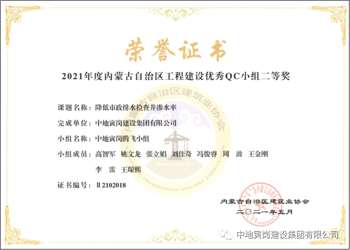 我公司凭借着过硬的技术、丰富的施工经验,最终从众多企业中脱颖而出,通过内蒙古自治区工程建设质量管理小组竞赛活动评审委员会的严格评审,顺利获得2021年度内蒙古自治区工程建设优秀QC小组二等奖。