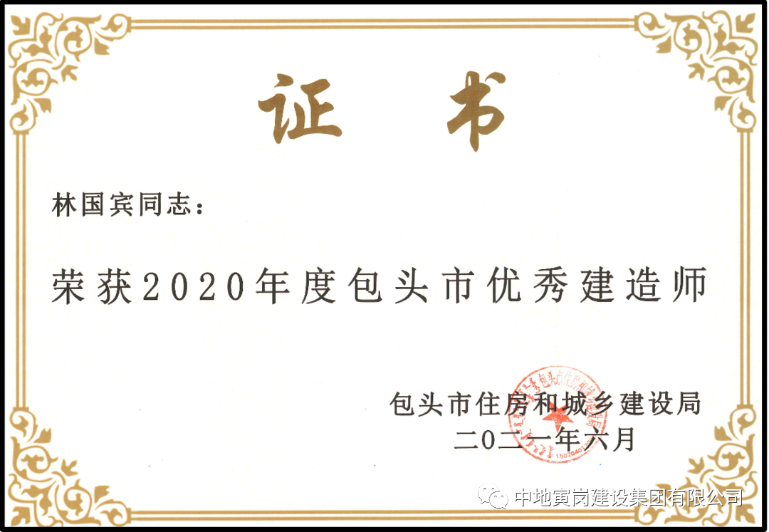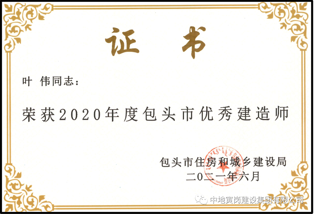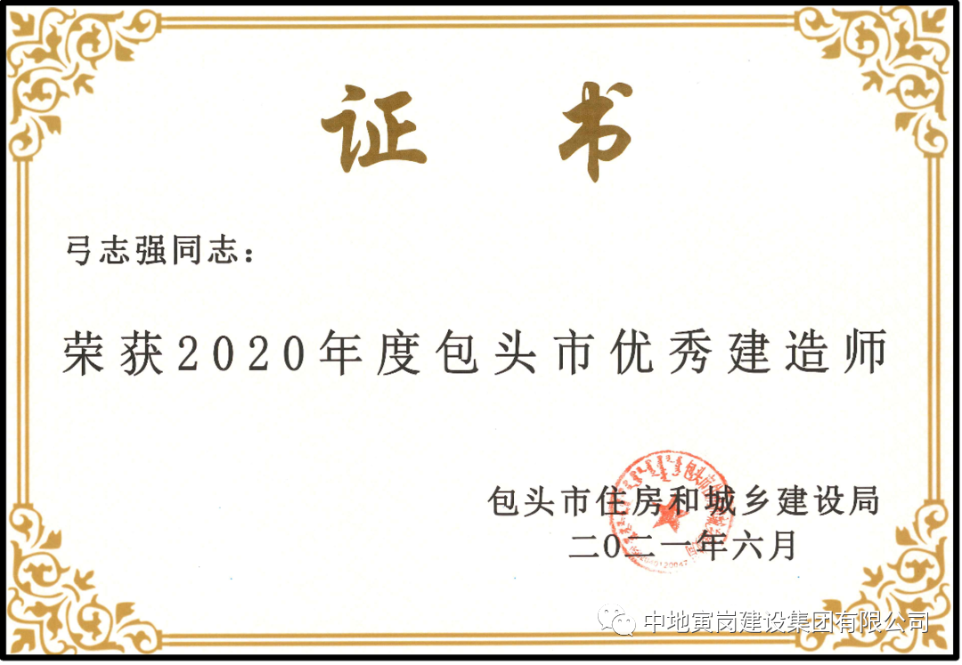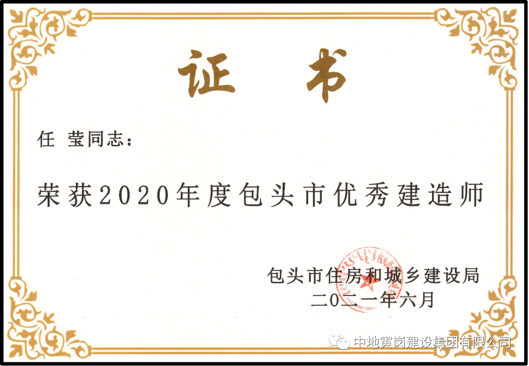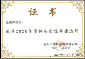 同时公司特别重视人才培养,2020年我公司有11位项目经理通过包头住建委评委会的严格审核,荣获2020年度包头市优秀建造师。