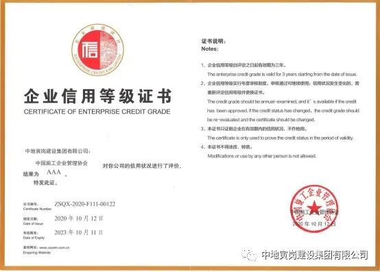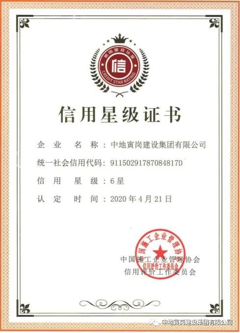 2017-2020年,寅岗集团连续4年荣获由中国施工企业管理协会颁发的AAA级企业信用等级证书,更是在2020年中国施工企业管理协会首次举行的企业星级评选活动中一路披荆斩棘,攻坚克难,凭借“十年如一日”的坚守信用,最终荣获六星级信用星级证书。