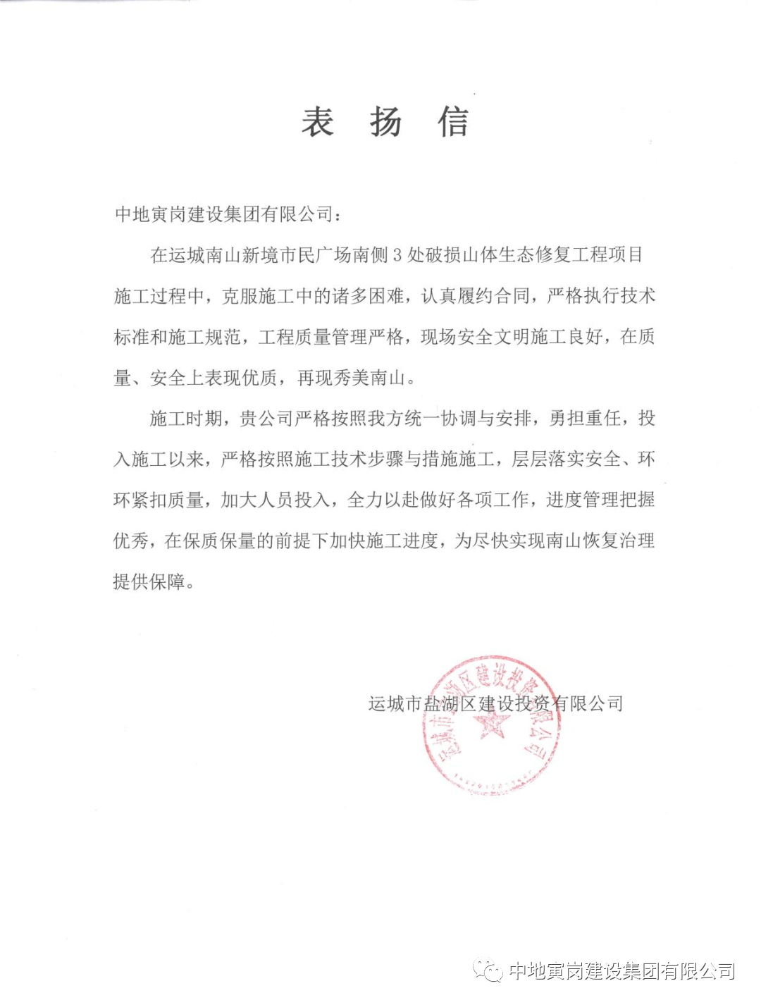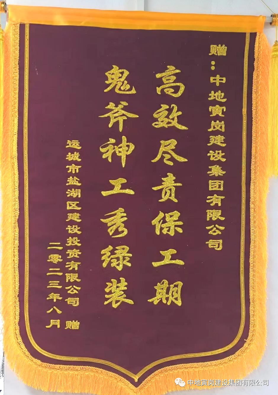 中地寅岗建设集团有限公司始终坚持科学管理,不断提升工程质量管理的系统性、科学性和经济性,努力打造更多设计优、质量精、技术先进、节能环保的项目,为造福百姓发挥热量,为社会发展贡献力量。集团承建的“运城南山新境市民广场南侧3处破损山体生态修复工程项目”于2023年8月受到运城市盐湖区建设投资有限公司的表扬并颁发锦旗。